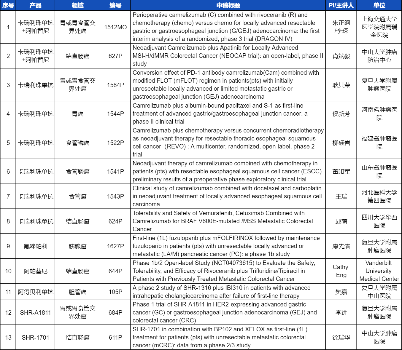 在消化系统肿瘤领域,DB真人创新产品相关研究共入选1项口头报告和12项壁报展示。除了经典的明星药物卡瑞利珠单抗和阿帕替尼,SHR-A1811、SHR-1701等未上市创新产品也有相应研究入选。此外,阿得贝利单抗、氟唑帕利等已上市药物也在积极探索新的适应症,本次ESMO大会分别有肝内胆管癌和胰腺癌相关研究入选。这些新老药物前沿研究的不断出现,有望为消化系统肿瘤患者带来新的福音!